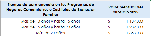Para las beneficiarias del Programa de Subsidio a la Vejez para exMadres Comunitarias y exMadres Sustitutas, el valor del subsidio está determinado por el tiempo de permanencia al Programa de Hogares Comunitarios y Sustitutos del Instituto Colombiano de Bienestar Familiar, y aumentará en cada anualidad según Indíce de Precios al Consumidor (lPC), valor que se aproximará al múltiplo de 1000 superior más cercano, el Administrador Fiduciario del Fondo de Solidaridad Pensional, efectuará los ajustes requeridos para la programación y pago de los subsidios: